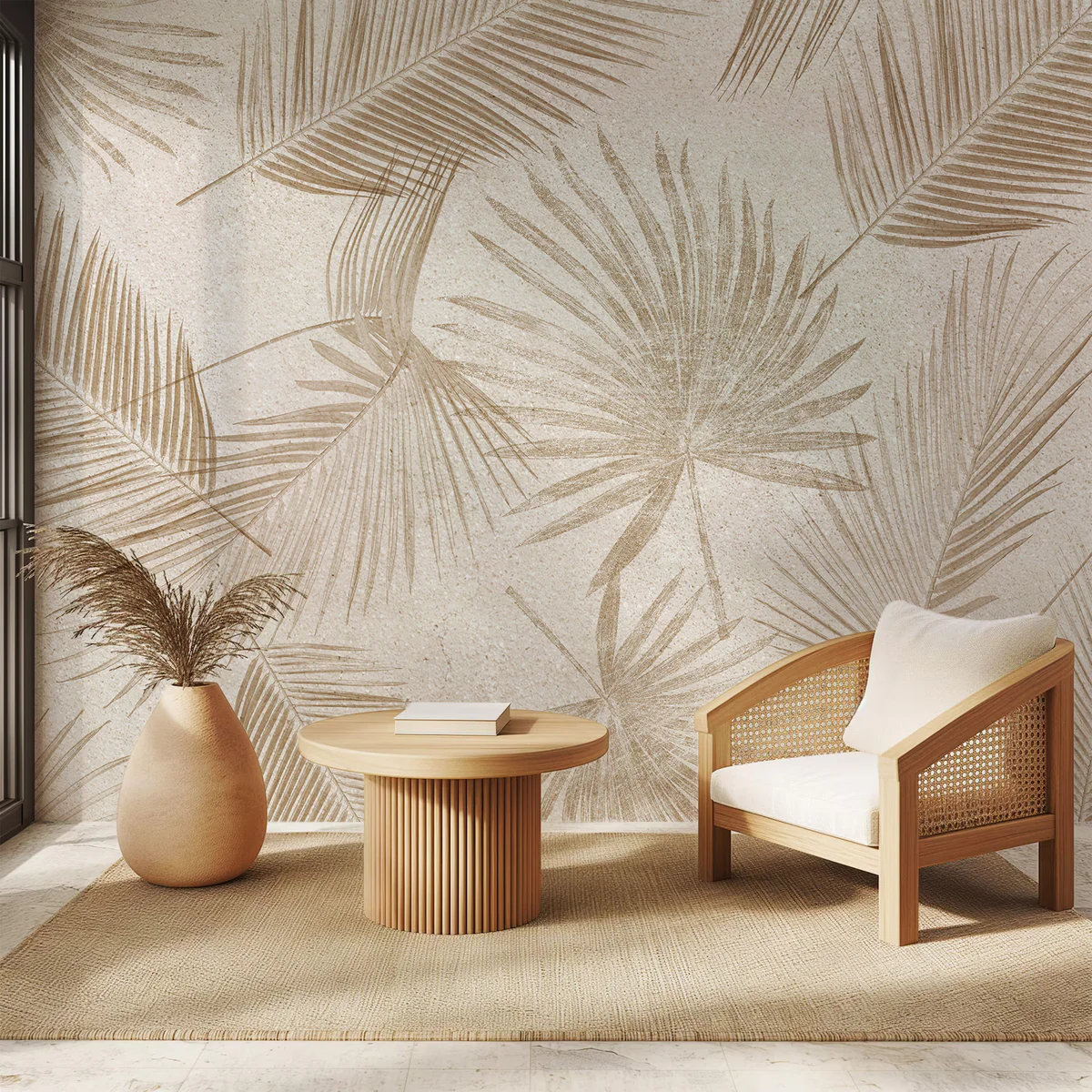 Preciosos Papeles Murales resistente a roces y lavables, impresos en papel Textura Lino Motivo Palmera Sepia.